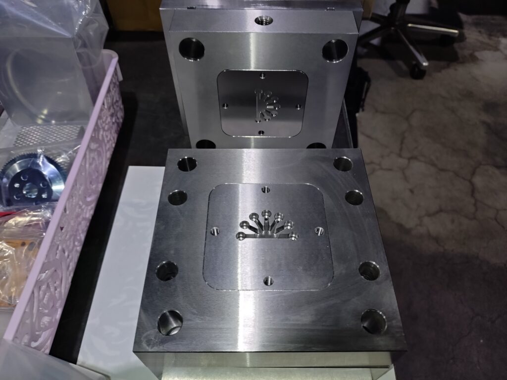 なかなかいい面構えでしょう?10センチ角くらいのステンレス製で持ち運ぶ重量も考えたつもりなのですが、重い(笑)。金型にしてはもちろん軽いんですけど!形は協和精機のロゴマークです。ちなみに振り子です。行雲流水的な意味を持っています。