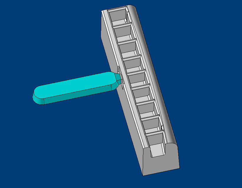 白が製品、水色がゲート部分です。シンプルなので加工・調整がしやすいのと比較的金型費も安価になりやすいです。デメリットは成型後の後加工が必要な点です。画像の白と水色はくっついた状態で出てくるのでニッパーで切ったりカッターできれいに仕上げたり、成形においては手間=コストがかかります。少し変わっているのだとプラモデルはサイドゲートを切らずにそのまま販売していますね。