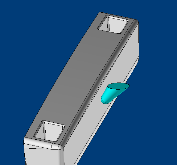 わかりにくいですね!斜めから先細りのゲートを入れる方法です。こちらもピンゲートと同じで型開きと同時に切り離されるので成型後の手間が少ないです。ピンゲートを横に入れるイメージですかね?デメリットはけっこう無理やり斜めにちぎるので樹脂のごみが付着しやすいです。