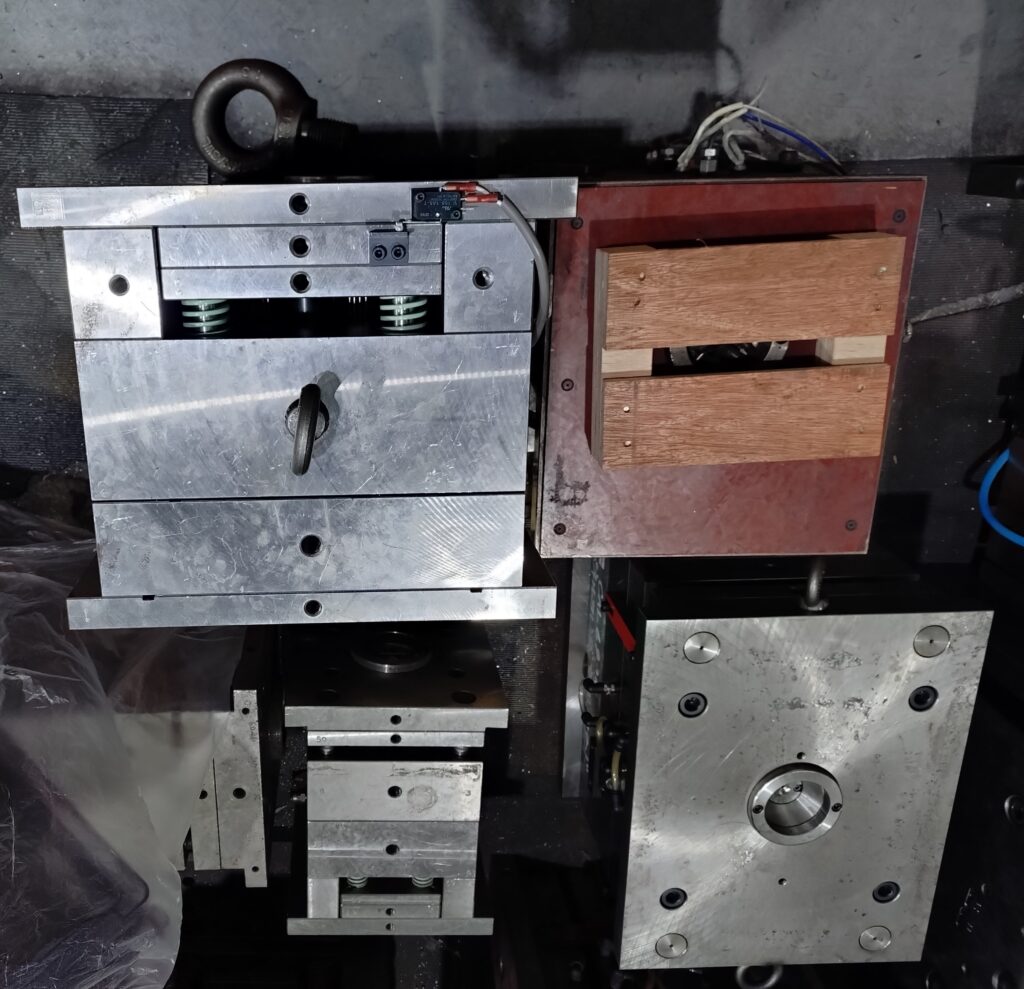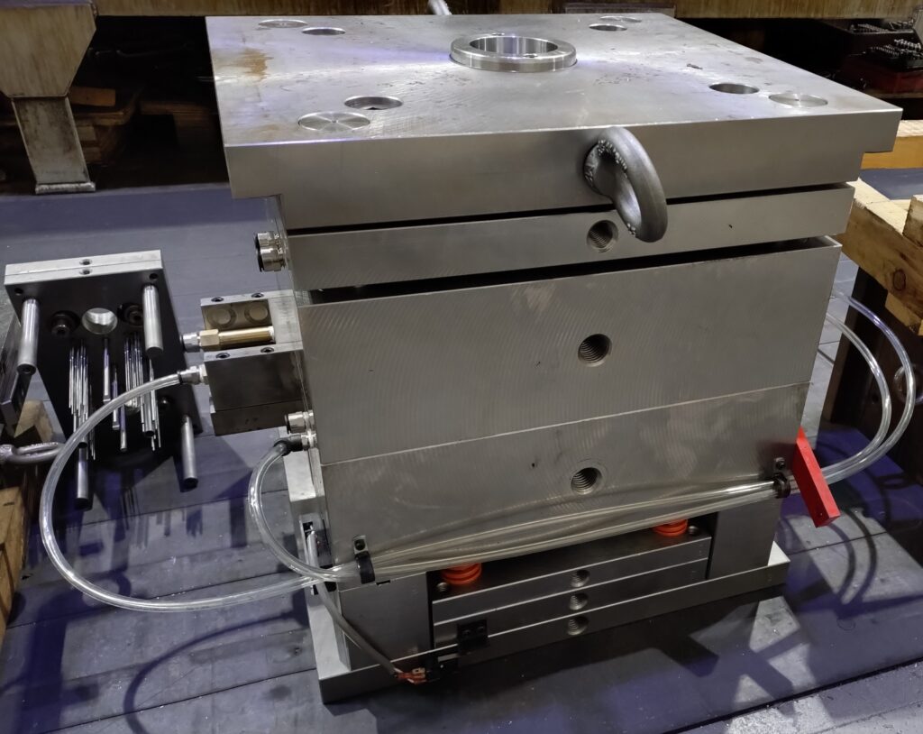 こちらはどうでしょう?横に部品のような物が付いていたりホースが伸びていたり。プレートの枚数も物によって違いますよね?金型はお客様のご希望に合わせて完全特注で製作されています。