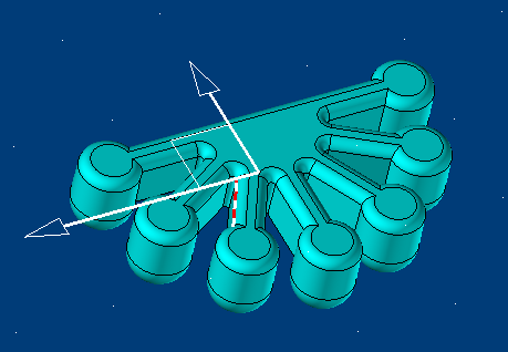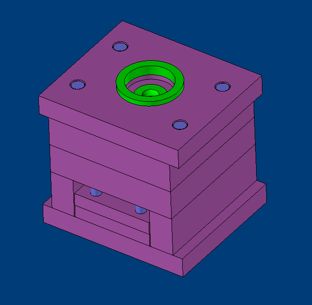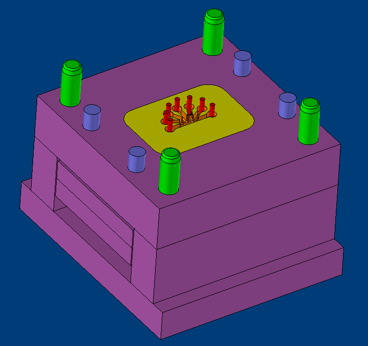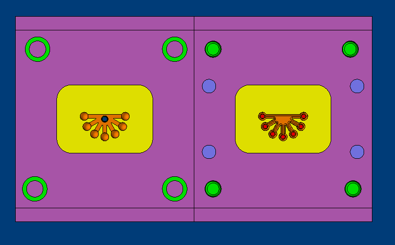 オレンジ色の部分に溶かした樹脂を流し込んで冷却する事でさっきの水色の製品が出来上がる、という構造です。そして成形された製品の取り出しについて。上画像の右側に赤い丸があるのですが、これは全部ピンになっていて動きます。